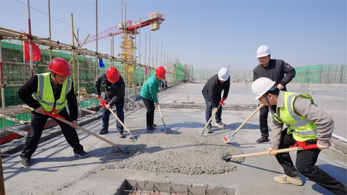 上午9時58分,在眾人的矚目中,參加封頂儀式的領導和嘉賓,鄭重鏟起象征圓滿和希望的最后一方混凝土,隨著混凝土精準地注入預定位置,現(xiàn)場掌聲雷動,禮炮齊鳴,封頂儀式取得圓滿成功。